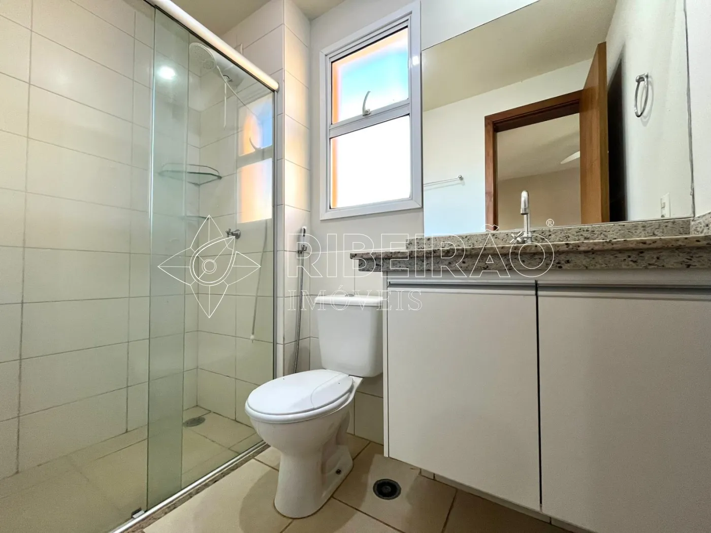 - 1 banheiro com armário, box e espelho;