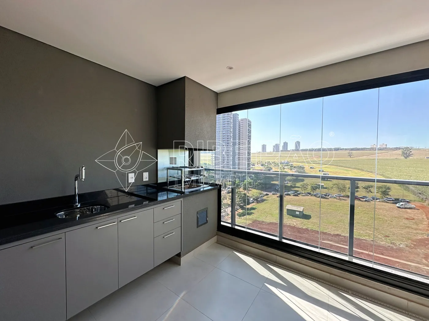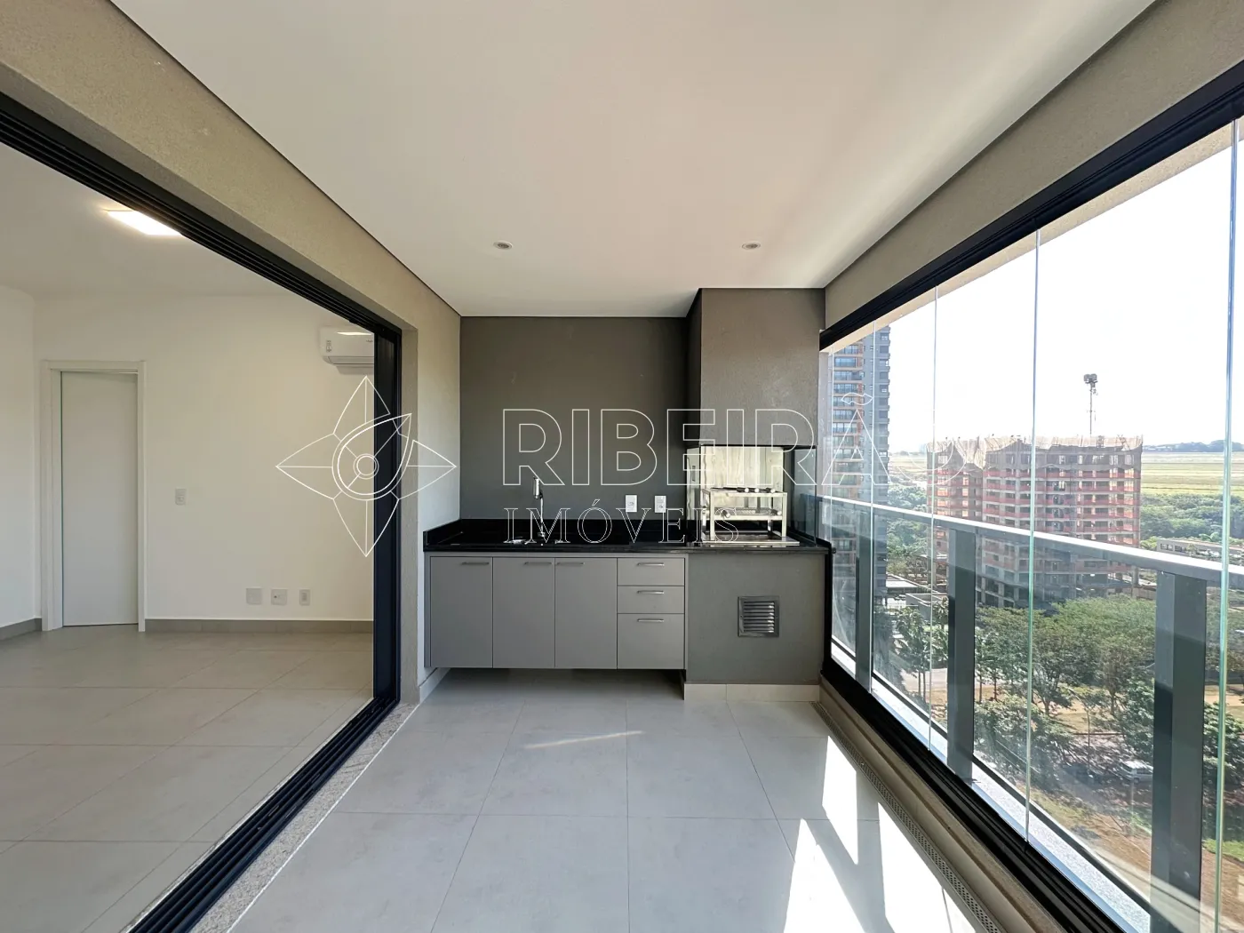 - Sacada Gourmet com churrasqueira, armários planejados e fechamento em vidro