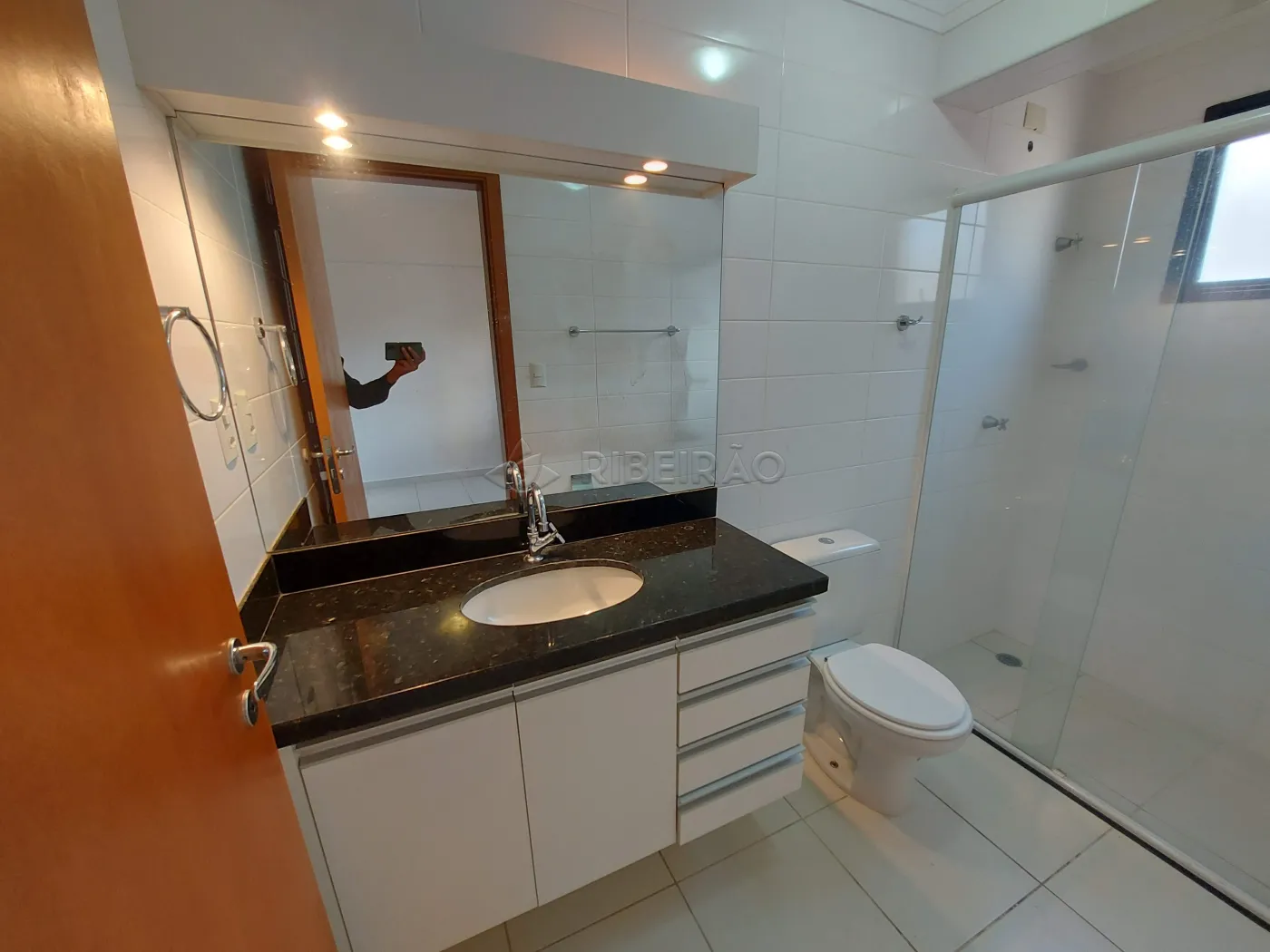 - Banheiro com box, espelho e gabinete;