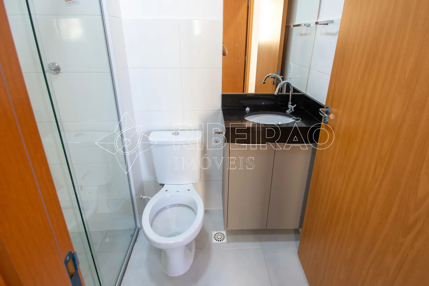 - 1 banheiro com armário, box e espelho;