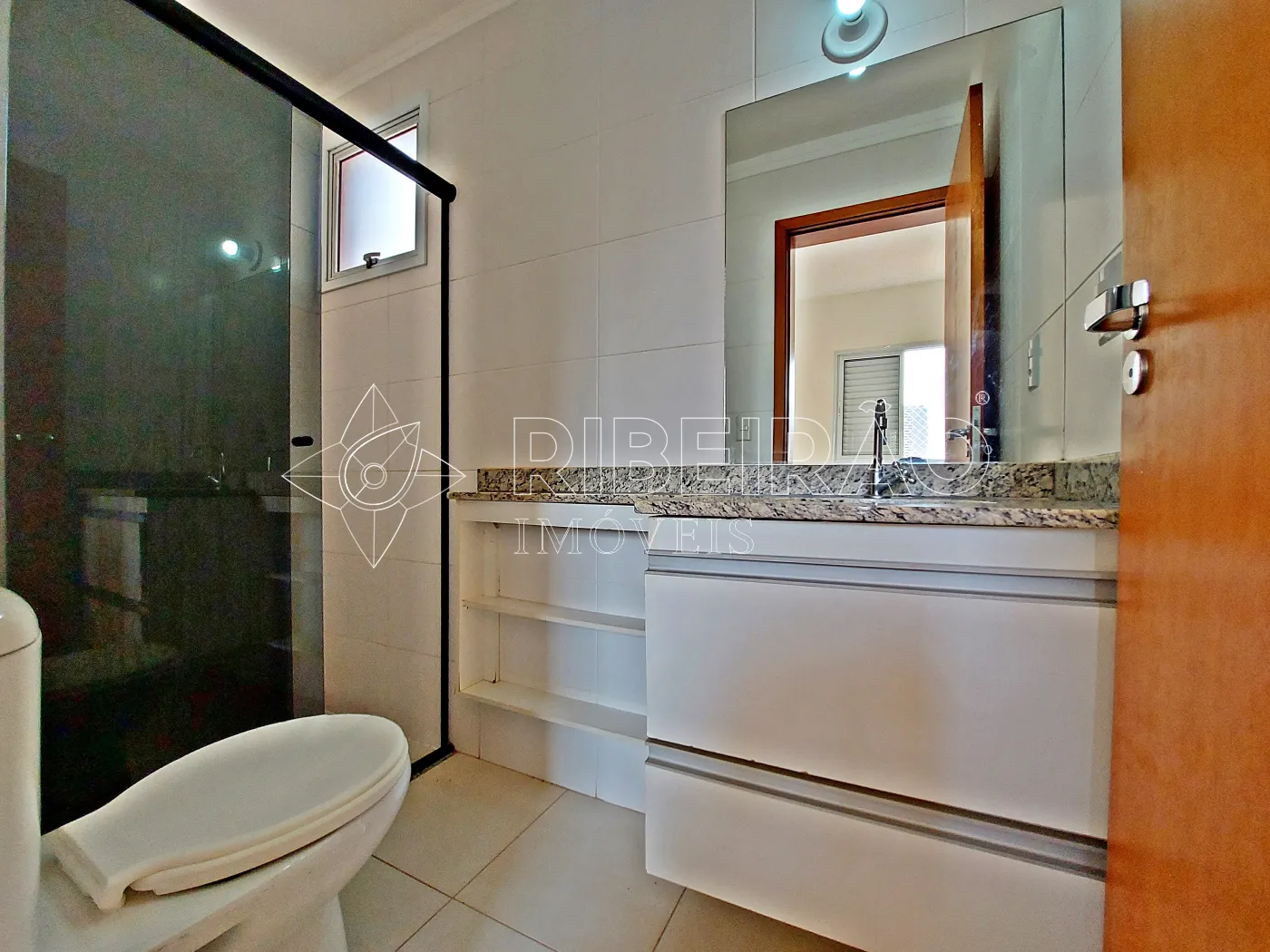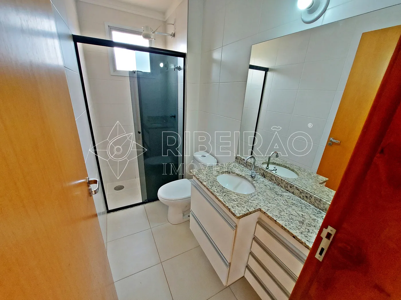 - Banheiros com box, gabinete e espelho