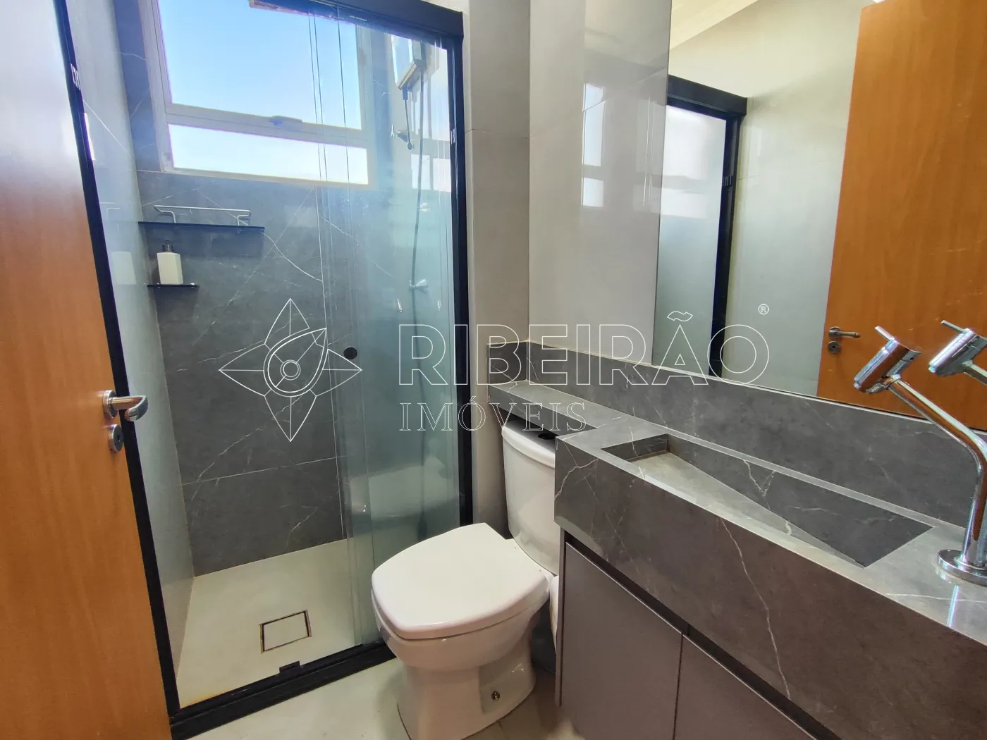- 1 banheiro com armário, box e espelho;