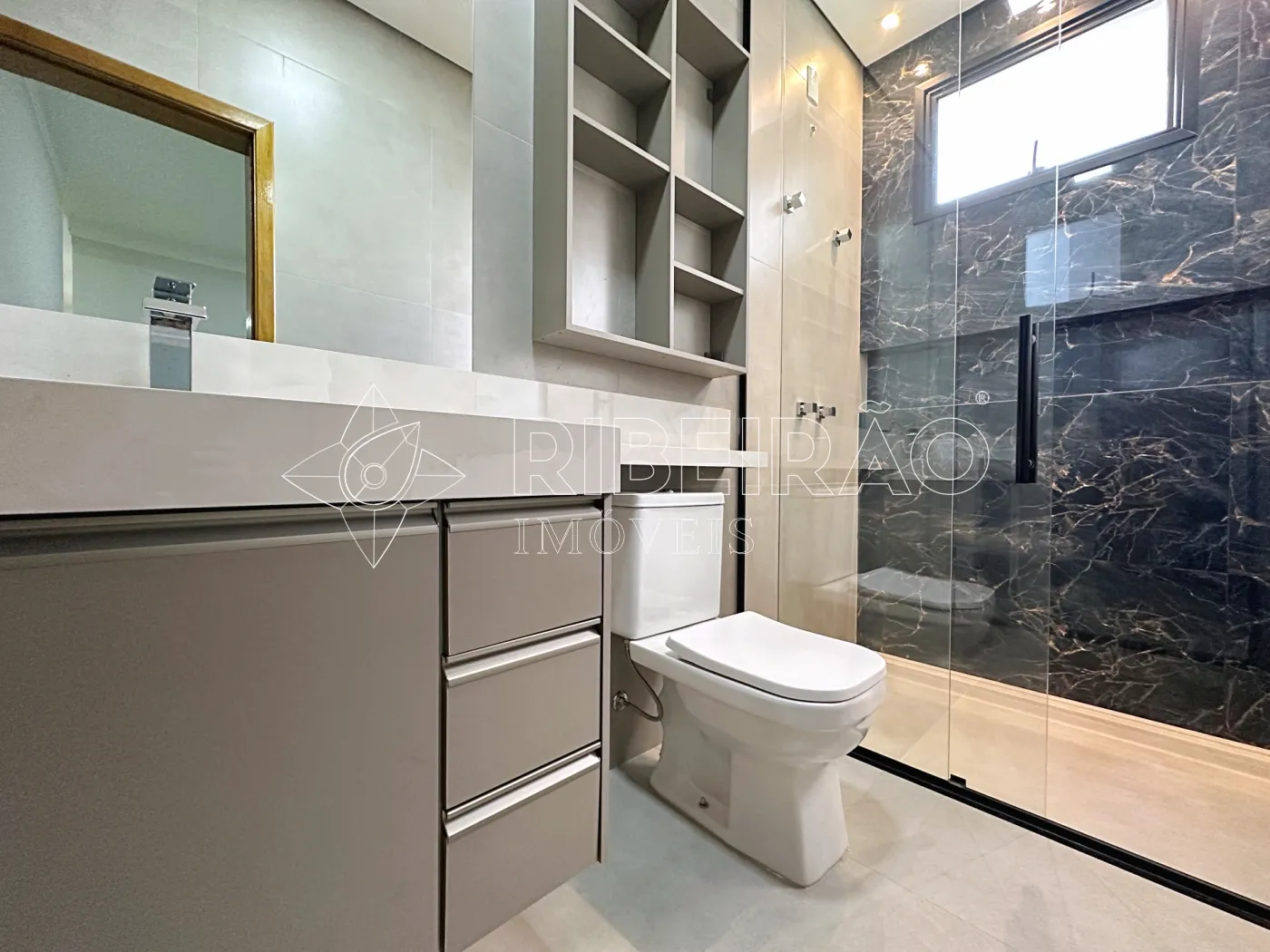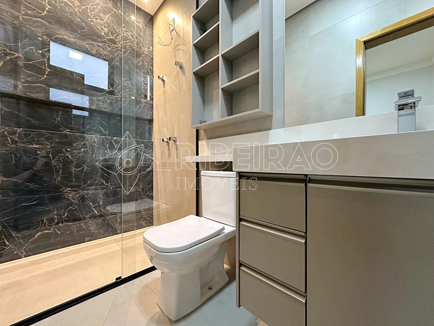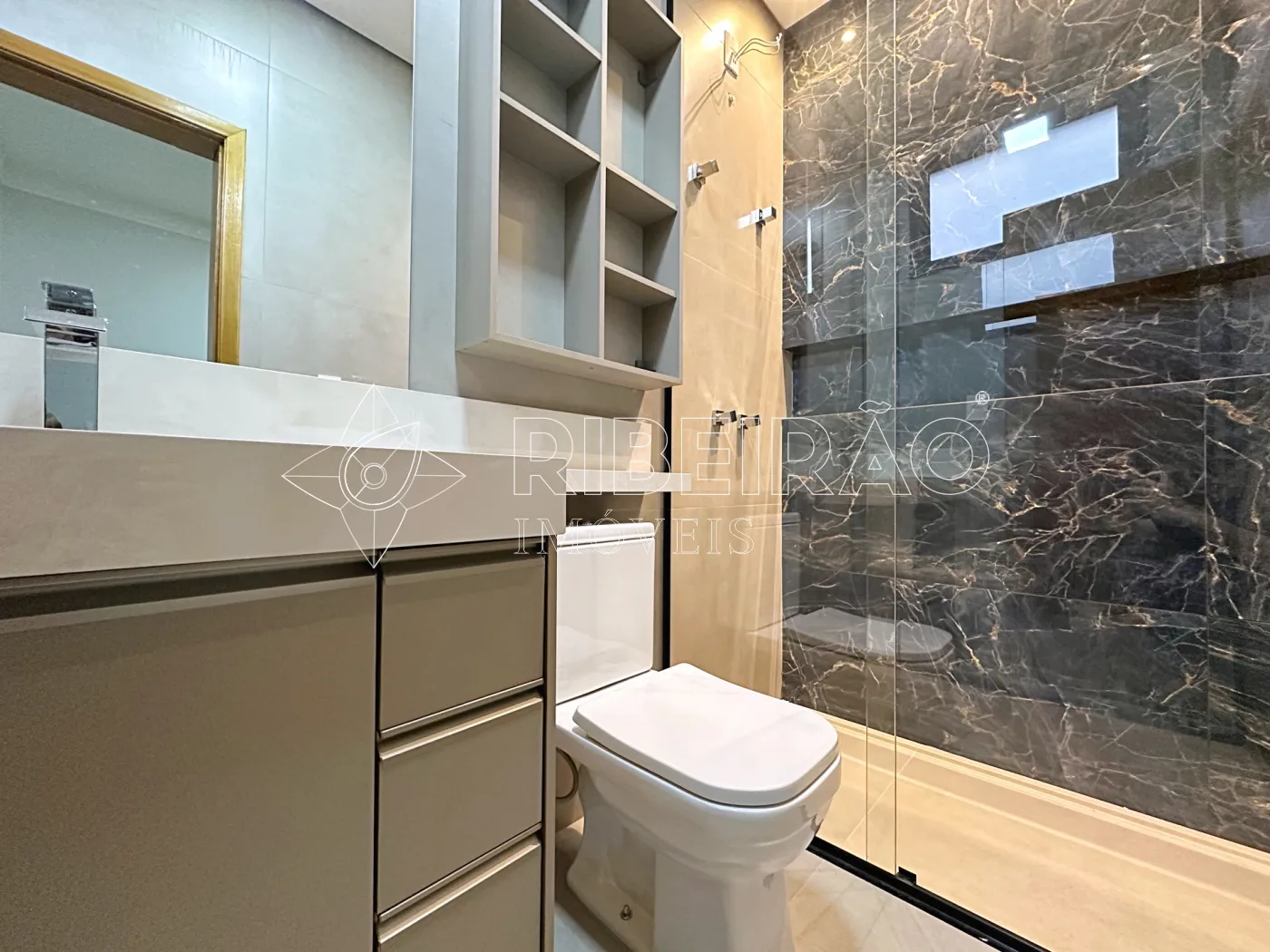 - Banheiros com box, armários planejados e espelhos