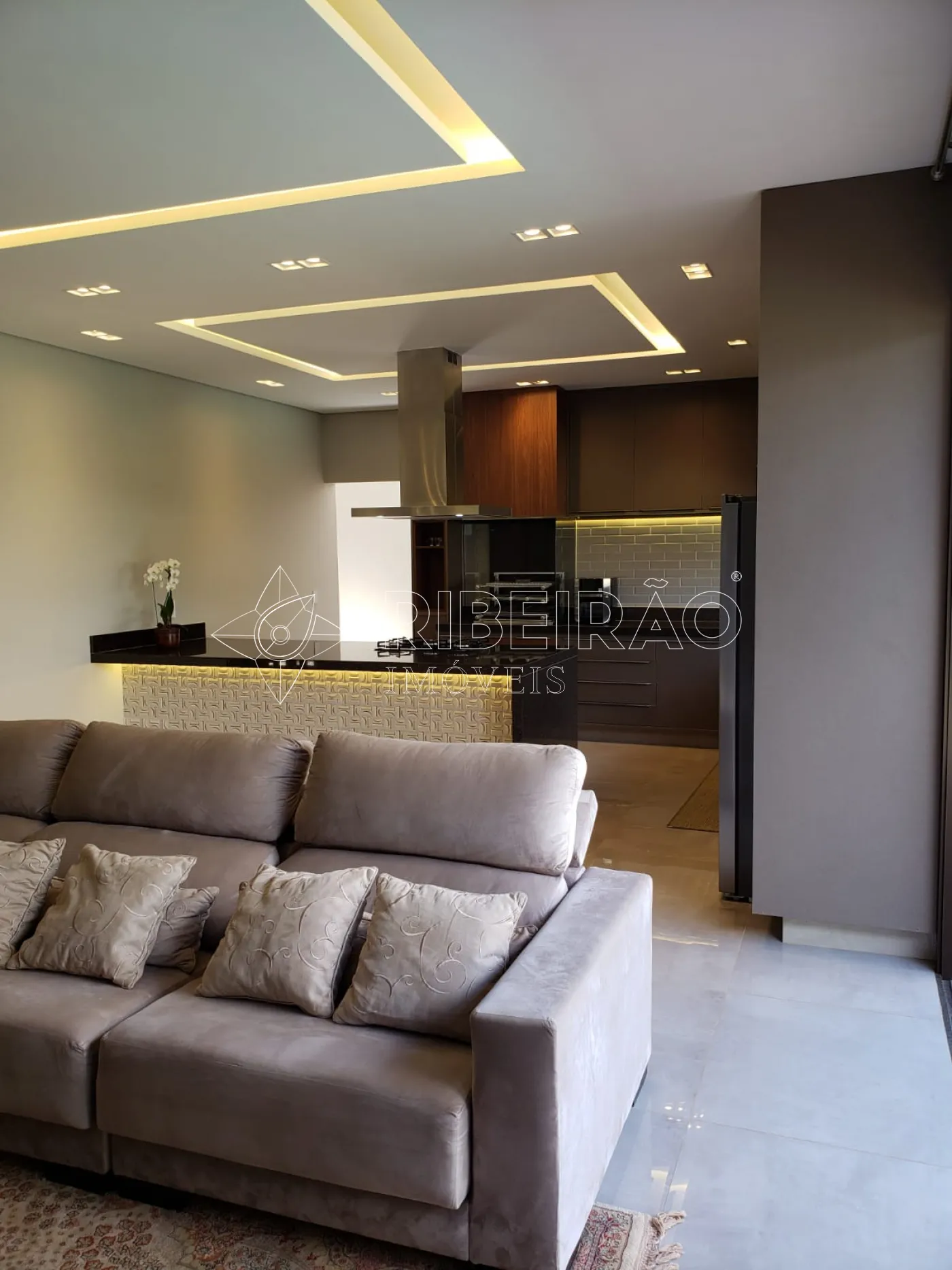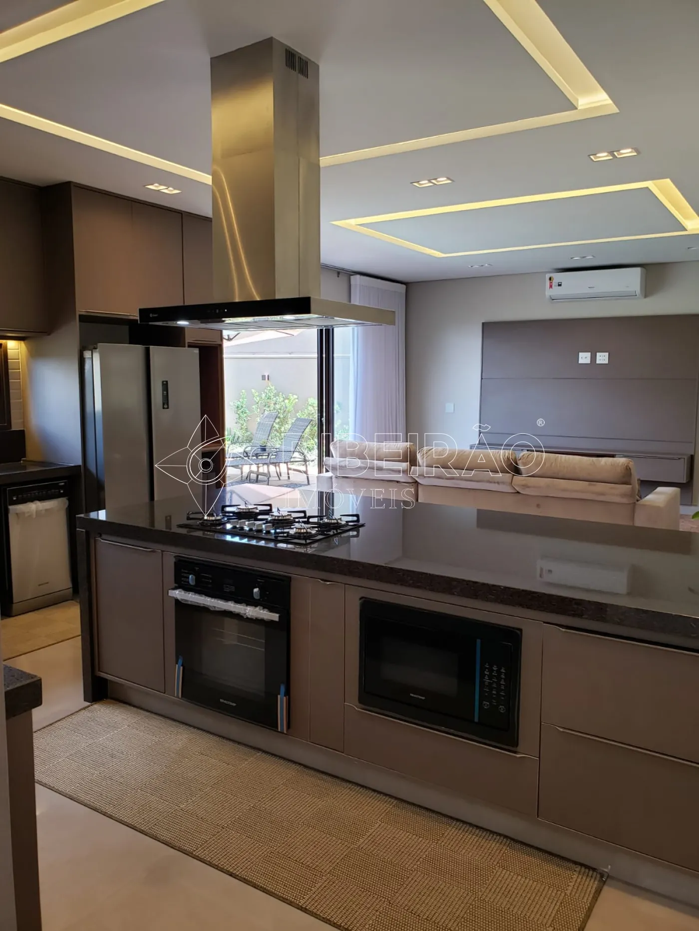 - Cozinha integrada com armários planejados e completa em eletrodomésticos.