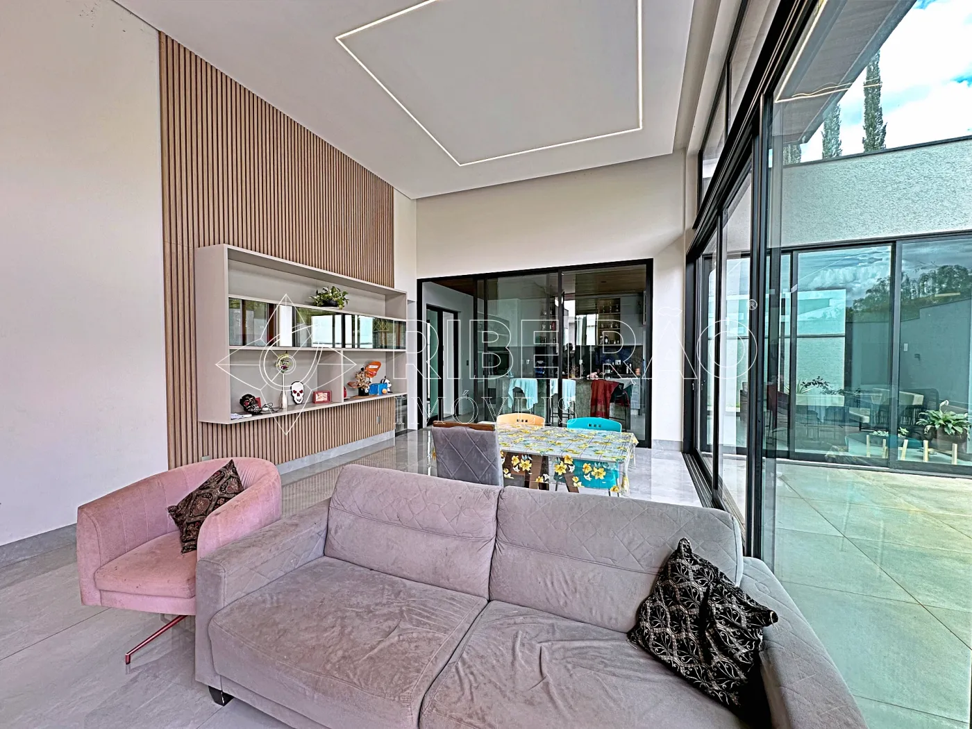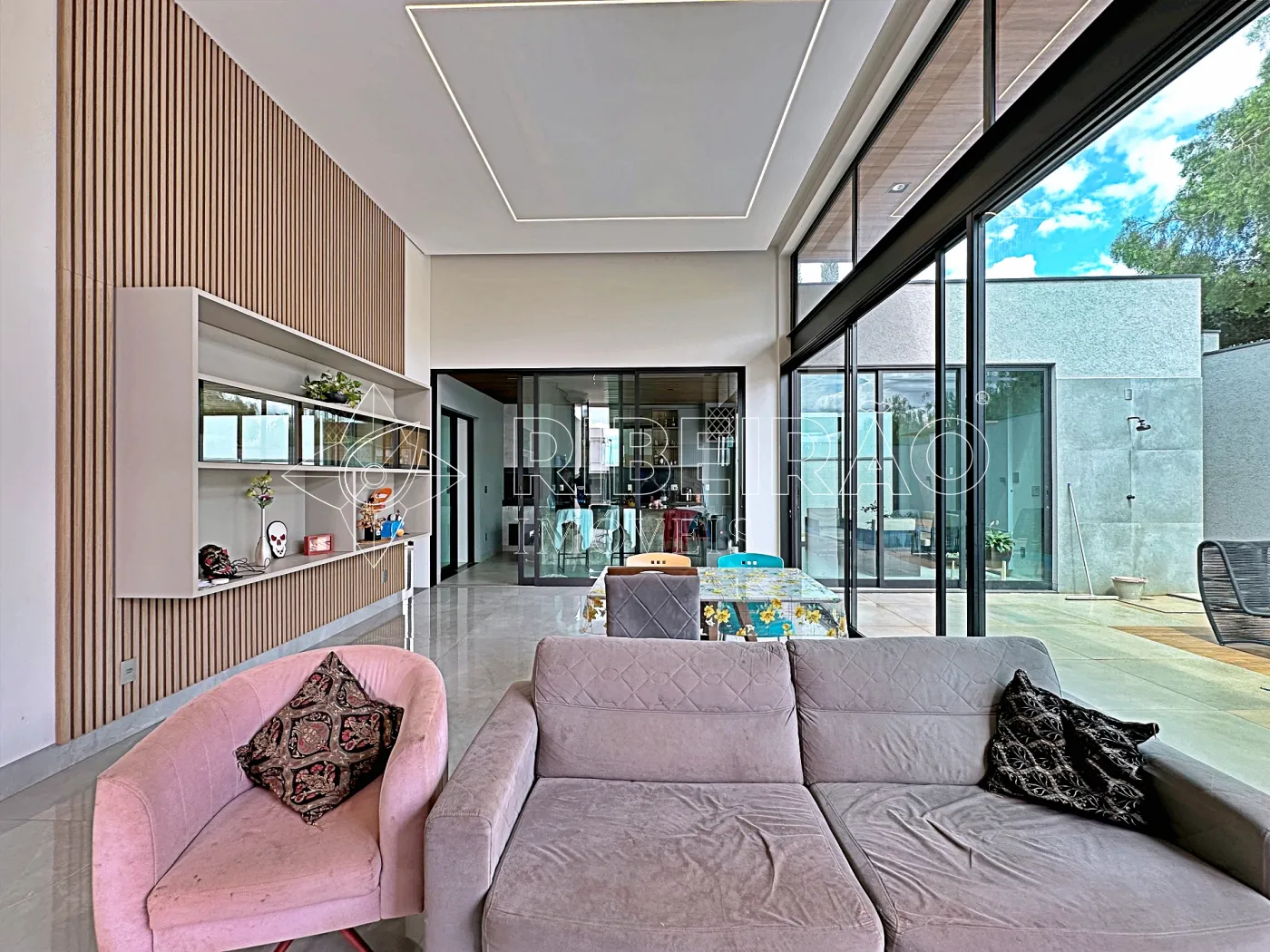 - Living 02 ambientes com raque, painel de TV e fechamento em vidro